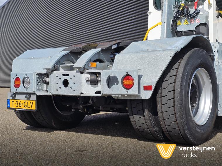 Cabine • Ruitenwisser vóór met ruitensproeier en interval • 2 buitenspiegels • 1 paraboolspiegel • Grote binnenverlichting • Geïntegreerde verwarming • Ruitenwisser voorzijde cabine • Zonneklep voorzijde (horizontaal, volle breedte op voorruit) • Horizontale schuifruit aan bestuurderskant • Alle ramen gehard en getint veiligheidsglas (voorruit gelaagd) • Full color multifunctioneel 5” CAN-bus informatiescherm (DIM) • Opbergruimte voor beker, documenten, helm en accessoires • Geveerde cabine • Kantelbegrenzer • Gele handgrepen (RAL1003) • Spatlappen links + rechts op cabine boven voorwielen Elektra • 7-polige elektrakabel • Achteruitrijdzoemer (90 dB(A)) • LED-zwaailamp • CAN-bus gestuurd systeem • Schakelaars met LED-controlelamp • Claxon • LED-koplampen met knipperlichten en LED-achterlichten (achterzijde cabinedak) • LED-werklamp op achterzijde cabinedak (deurzijde) • 7-polige elektra-aansluiting achter cabine (24V, ISO1185) • 7-polige elektra-aansluiting achter cabine (ABS/EBS, ISO 7638) • Snelheidsmeter (km/uur) • Luchtketels, totale capaciteit 111 liter • 2-leiding AHW-remsysteem achter cabine, met gele en rode spiraalslangen + automatische koppelingen • Remsysteem conform EG 71/320 • Luchtdroger in remsysteem Achteras • Minimale schotelhoogte: ± 1177 mm (andere hoogtes op verzoek) • Maximale hefhoogte: ± 1635 mm (vanaf de grond) • Kunststof spatborden • Oprijdprofielen naar de schotel • Luchtvering Openbare weg pakket Nederland (mobiele machines) • Snelheidsbegrenzing: max. 40 km/h • Achterverlichting verplaatst naar achterplaat • Trottoirspiegel • Achterreflectoren • RDW-keuring en registratie Brandstof/Hydrauliek • Hydrauliektank 60 liter • Dubbelwerkende hydraulische hefcilinders (enkeltraps, slag 425 mm) Chassis • Bumperpenvoorziening voor- en achterzijde • Chassis achterzijde voorbereid voor drawbar-koppeling • Afdekplaten en zijpanelen bij de zijkasten (links + rechts) • Liftframe, zijpanelen, treden en beplating thermisch verzinkt Stuurinrichting & Hydraulisch systeem • Vaste, naar voren gerichte stuurkolom • Hydraulische tank 60 liter • Dubbelwerkende hefcilinders, slag 425 mm • Koppelschotelontgrendeling alleen bij stilstand (< 2 km/h) • Ontgrendelen koppelschotel via twee schakelaars |
