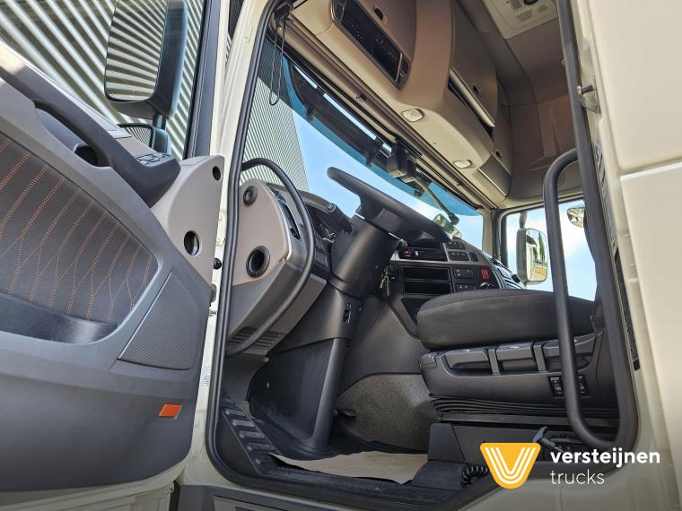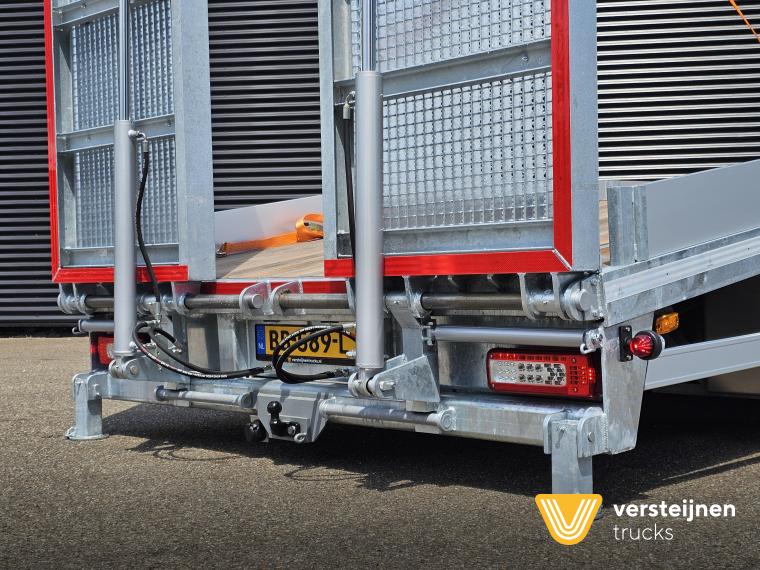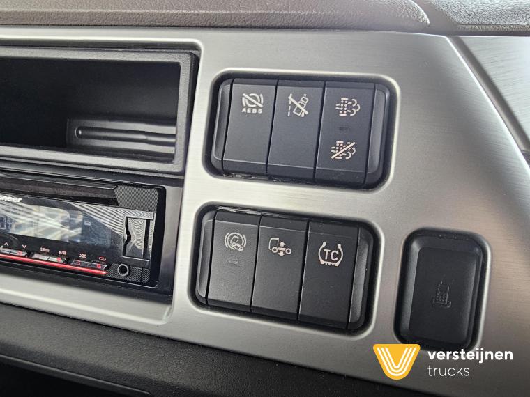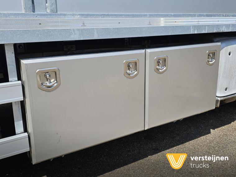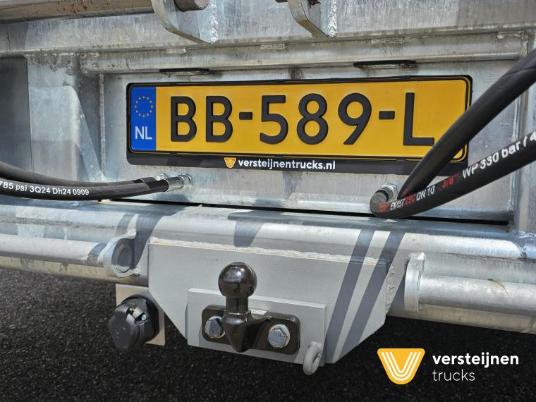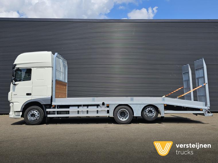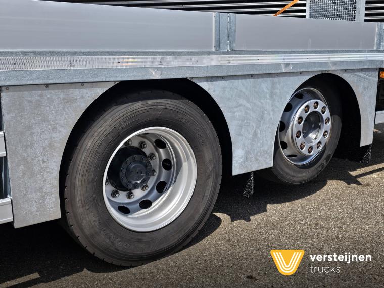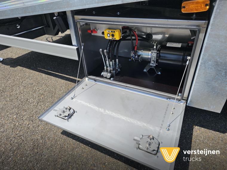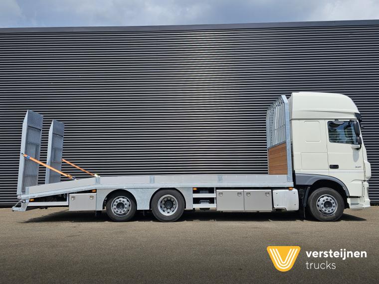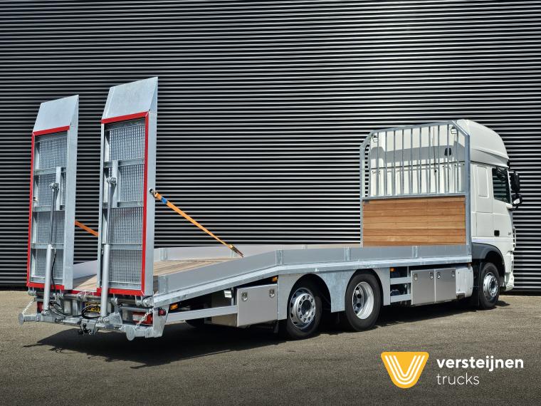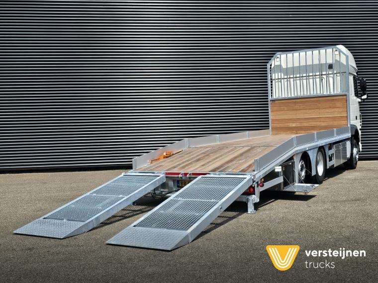 Daf XF 450 Superspacecab. 6x2 met liftas. Euro 6. Stand airco. Nieuwe oprij bak. Lengte: 785 cm. Breedte tussen de rongen: 243 cm Laadvloer breedte: 255 cm. Laadvloer hoogte 109 cm. Gegalvaniseerd. Hydraulische rampen. Hydraulisch tegen elkaar aan te schuiven. 2 x RVS gereedschap kist. Hardhouten vloer. Bindogen verzonken in de vloer. Afneembare rongen en schotten. 3.500 kg kogelkoppeling. |