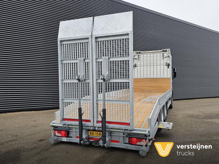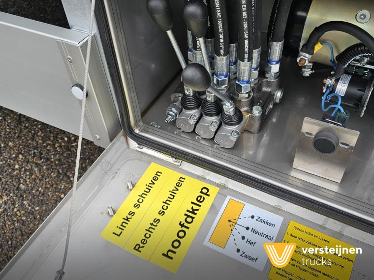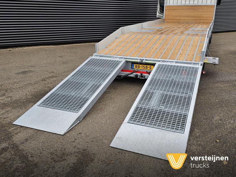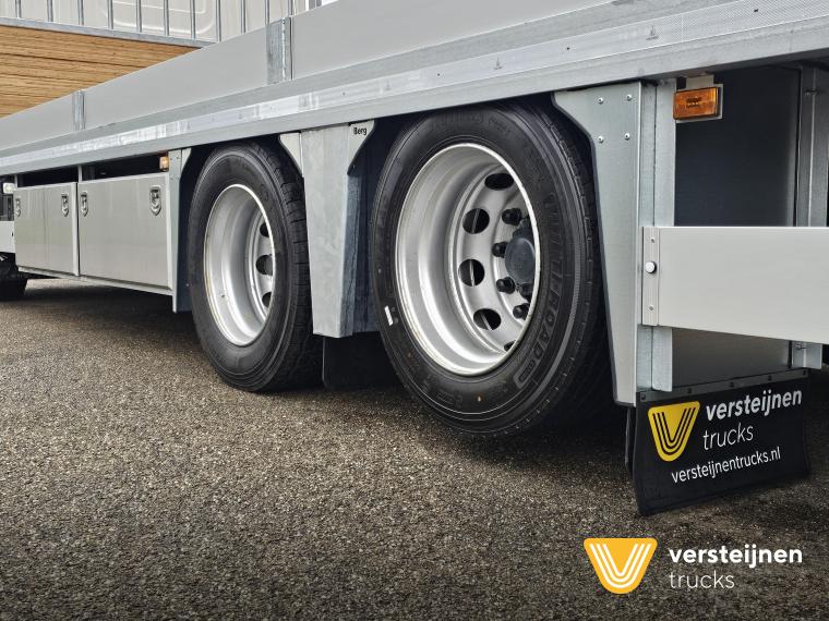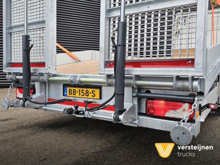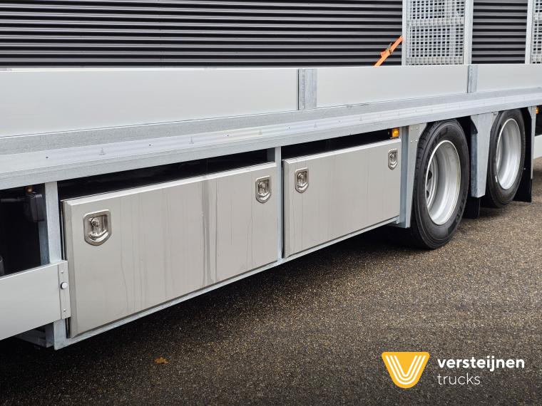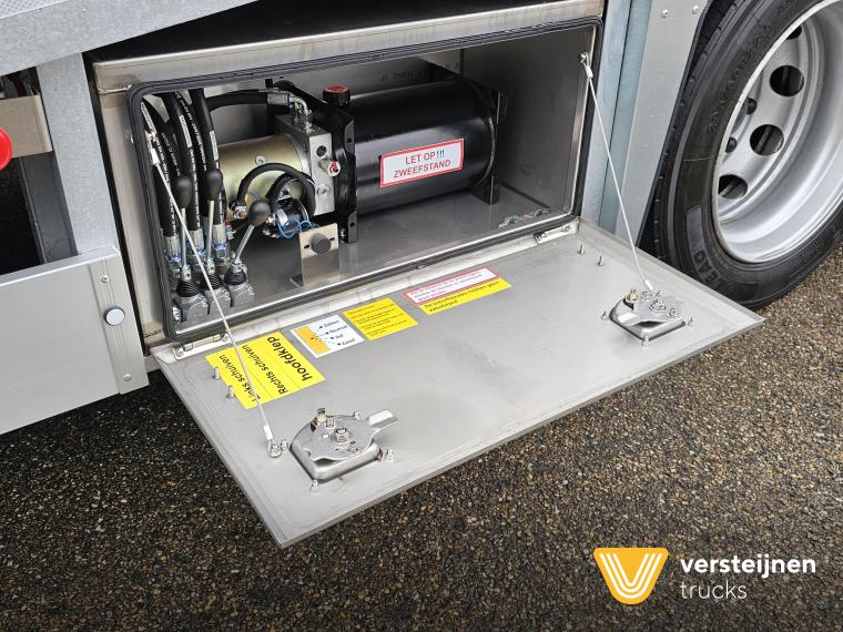 Nieuwe oprij bak. Lengte: 806 cm. Breedte tussen de rongen: 243 cm Laadvloer breedte: 255 cm. Laadvloer hoogte 105 cm. Gegalvaniseerd. Hydraulische rampen. Hydraulisch tegen elkaar aan te schuiven. 2 x RVS gereedschap kist. Hardhouten vloer. Bindogen verzonken in de vloer. Afneembare rongen en schotten. 3.500 kg kogelkoppeling. |